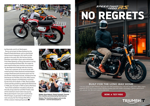 by Reynolds and Co of Wellington. Percy came back to New Zealand as the Royal Enfield distributor and, as the British Government imposed a 32 % tariff on USA goods in the early 30s, the factory Harley Davidson and Indian racers were withdrawn from New Zealand, so Percy focused on racing and tuning Royal Enfield 350s. He made his own engine brake test machine and shared his development findings with the factory. Percy was a pioneer of so much to do with motorcycling in New Zealand and developed a large wholesale parts business post-war for the British motorcycle brands, and became the Distributor for Panther, AJS, Ariel, NSU, Suzuki, Lambretta, Norton and Matchless machines by the time of his death in 1966. Rod and Bob continued the growth by adding the BSA brand in 1968, plus Triumph in 1969 as well as Montesa. Part of the exhibition included a tribute to the late Greg Coleman and Neil Forbes, two of the Coleman’ s team taken too young. We’ re planning for next year’ s event to be MUCH larger, so get down to Whanganui next January for the Vintage Weekend, it’ ll be a classic motorcycling treat.