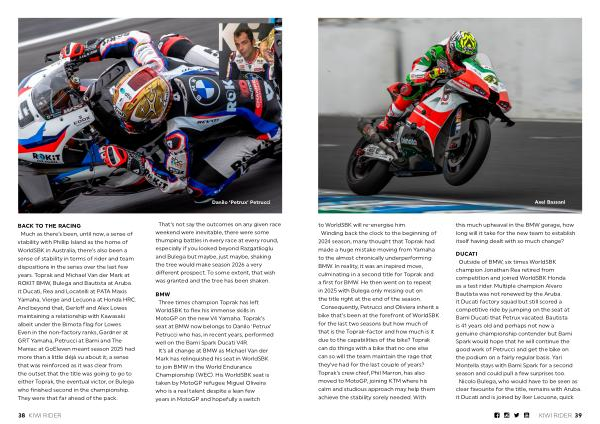 BACK TO THE RACING Much as there’ s been, until now, a sense of stability with Phillip Island as the home of WorldSBK in Australia, there’ s also been a sense of stability in terms of rider and team dispositions in the series over the last few years. Toprak and Michael Van der Mark at ROKIT BMW, Bulega and Bautista at Aruba. it Ducati, Rea and Locatelli at PATA Maxis Yamaha, Vierge and Lecuona at Honda HRC. And beyond that, Gerloff and Alex Lowes maintaining a relationship with Kawasaki albeit under the Bimota flag for Lowes. Even in the non-factory ranks, Gardner at GRT Yamaha, Petrucci at Barni and The Maniac at GoEleven meant season 2025 had more than a little déjà vu about it, a sense that was reinforced as it was clear from the outset that the title was going to go to either Toprak, the eventual victor, or Bulega who finished second in the championship. They were that far ahead of the pack.