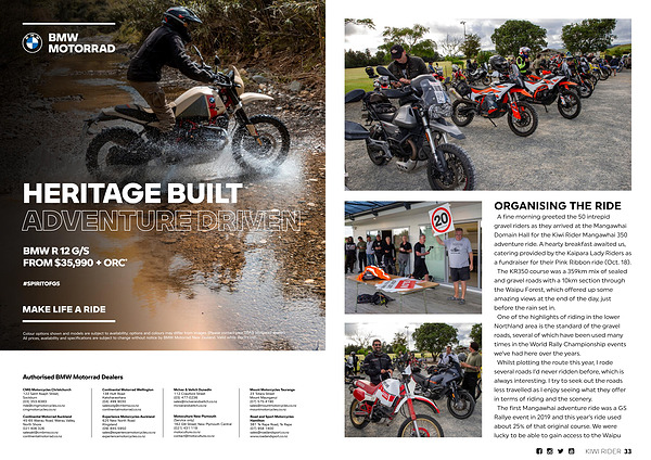 A fine morning greeted the 50 intrepid gravel riders as they arrived at the Mangawhai Domain Hall for the Kiwi Rider Mangawhai 350 adventure ride. A hearty breakfast awaited us, catering provided by the Kaipara Lady Riders as a fundraiser for their Pink Ribbon ride( Oct. 18). The KR350 course was a 359km mix of sealed and gravel roads with a 10km section through the Waipu Forest, which offered up some amazing views at the end of the day, just before the rain set in. One of the highlights of riding in the lower Northland area is the standard of the gravel roads, several of which have been used many times in the World Rally Championship events we’ ve had here over the years. Whilst plotting the route this year, I rode several roads I’ d never ridden before, which is always interesting. I try to seek out the roads less travelled as I enjoy seeing what they offer in terms of riding and the scenery. The first Mangawhai adventure ride was a GS Rallye event in 2019 and this year’ s ride used about 25 % of that original course. We were lucky to be able to gain access to the Waipu