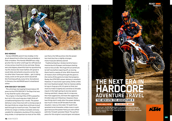 out there, the 500 punches into the power less hard, but has a slightly stronger, more muscular delivery overall. Traditional big four-strokes tend to have a massive burst of power and torque starting more or less at idle. This huge thrust continues to half revs before tapering off, so revving them hard is a waste of time. With those kind of motors short-shifting through the gears is the name of the game to make fast progress. Really, the KTM 500’ s power delivery is excellent. However, if I was to be super picky, I’ d like a little bit more flywheel weight. Not to improve ability to lug or chug up a hill, it’ s great at that, but more to make it slightly less sensitive to throttle inputs in the tight going at very low speed. Having said that, I always ride it in map one, the most aggressive, and have the aggressive throttle tube cam fitted too. However, these two things don’ t really alter the power delivery too much in that on / off throttle from idle situation. I also run the taller 14-tooth front sprocket to let it breathe a little more in each gear because the power feels just a bit stifled with the 13 tooth sprocket fitted. The perfect place for this engine is second gear and above.