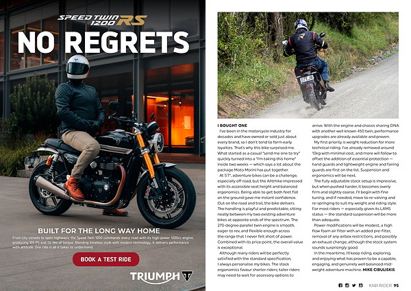 arrive. With the engine and chassis sharing DNA with another well known 450 twin, performance upgrades are already available and proven. My first priority is weight reduction for more technical riding. I’ ve already removed around 10kg with minimal cost, and more will follow to offset the addition of essential protection— hand guards and lightweight engine and fairing guards are first on the list. Suspension and ergonomics will be next. The fully adjustable stock setup is impressive, but when pushed harder, it becomes overly firm and slightly coarse. I’ ll begin with fine tuning, and if needed, move to re-valving and re-springing to suit my weight and riding style. For most riders— especially given its LAMS status— the standard suspension will be more than adequate. Power modifications will be modest, a high flow foam air filter with an added pre-filter, removal of any airbox restrictions, and possibly an exhaust change, although the stock system sounds surprisingly good. In the meantime, I’ ll keep riding, exploring, and enjoying what has proven to be a capable, engaging, and genuinely well balanced midweight adventure machine. MIKE CIBULISKIS