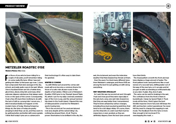 WINTER IS COMING So , with Winter just around the corner , wet roads will soon become a common theme for those of us who ride all year round . In the depths of last winter , I fitted a set of Metzeler ’ s Roadtec 01SE tyres to my Triumph Speed Triple RS , which I use for my daily commute , weekend laps of the Coro-Loop , and the annual Summer trip down to the South Island . I figured this mix of riding would be a real test for Metzeler ’ s sports-touring tyre . This is the second set I ’ ve used and abused now and , despite all the varied riding I do , nothing has phased them . At all . They ’ ve proven themselves to be brilliant in the dry , the