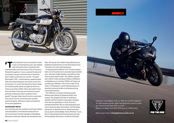 Gentleman ’ was an excellent movie . It was a contemporary yarn , yet loaded with old world charm , polished with sophistication and more than a hint of menace flowed throughout . It was a wonderful blend of raw power , beauty and excitement . And that , dear reader could also sum up the Triumph Bonneville T120 – contemporary , sophisticated with old school elegance and a hint , just a hint , of menace . For some the beautiful classic looks of the Bonneville will be enough for them to make a purchase . Older riders who didn ’ t have the coin back in the day are also keen buyers , perhaps endeavouring to recapture their youth ? Younger riders love the retro-cool looks too and , of course , all will love the sensible , practical layout , effortless engine and decent all-round capabilities .