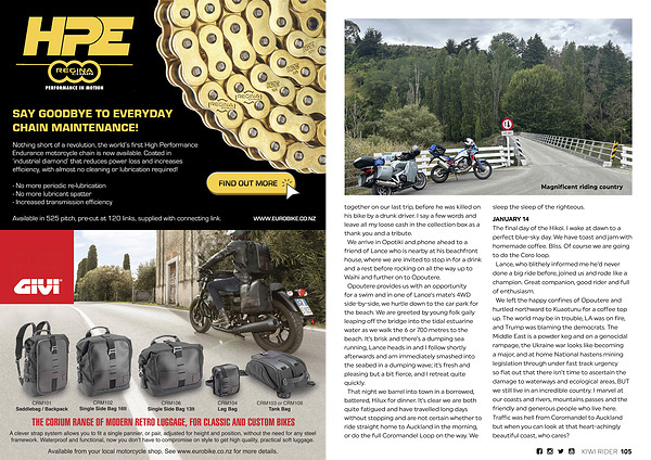Magnificent riding country together on our last trip, before he was killed on his bike by a drunk driver. I say a few words and leave all my loose cash in the collection box as a thank you and a tribute. We arrive in Opotiki and phone ahead to a friend of Lance who is nearby at his beachfront house, where we are invited to stop in for a drink and a rest before rocking on all the way up to Waihi and further on to Opoutere. Opoutere provides us with an opportunity for a swim and in one of Lance’ s mate’ s 4WD side-by-side, we hurtle down to the car park for the beach. We are greeted by young folk gaily leaping off the bridge into the tidal estuarine water as we walk the 6 or 700 metres to the beach. It’ s brisk and there’ s a dumping sea running, Lance heads in and I follow shortly afterwards and am immediately smashed into the seabed in a dumping wave; it’ s fresh and pleasing but a bit fierce, and I retreat quite quickly. That night we barrel into town in a borrowed, battered, Hilux for dinner. It’ s clear we are both quite fatigued and have travelled long days without stopping and are not certain whether to ride straight home to Auckland in the morning, or do the full Coromandel Loop on the way. We
