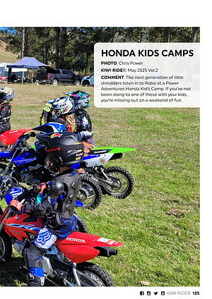 PHOTO: Chris Power KIWI RIDER: May 2025 Vol. 2 COMMENT: The next generation of little shredders listen in to Robo at a Power Adventures Honda Kid’ s Camp. If you’ ve not been along to one of these with your kids, you’ re missing out on a weekend of fun.