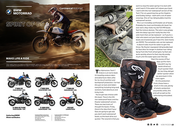 Enduro is an iconic boot. It’ s loved by enduro riders and adventure riders alike for its mix of comfort and bombproof protection. I’ ve had this pair on test and ridden everything including long road sections, hard adventure and tricky trails. You’ ve got two choices with this boot. There’ s the OG non-waterproof boot and the Drystar waterproof version. There are two trains of thought for boots. Firstly, there’ s the idea that if your feet are going to get wet you don’ t want waterproof boots, so the boot dries out quicker. The second is that you want to stop the water going in to start with and it won’ t if the water isn’ t above your boot. I went with the non-waterproof version of the Tech 7 for an upcoming trip up the Hopkins and Godley Valleys- both with a lot of water crossings. One of my riding buddies had the waterproof version. This is an incredibly comfortable set of boots. Probably the most comfortable dirt boot I’ ve ever worn, they make my old TCX MX boots feel like torture devices. The sole is very grippy with the deep lugs and I really like the midsole insert that can be replaced- so if you’ re a rider who wears out your boot soles before the boots are knackered, you’ ll love this. Sole inserts are $ 59.90. The complete sole can be replaced. It doesn’ t take much for water to get into these. My Drystar-equipped riding buddy kept his feet drier for longer in shallow river riding. Spray from the front wheel gets my feet wet quite quickly, where his feet stay dry pretty much until the water goes over the top.