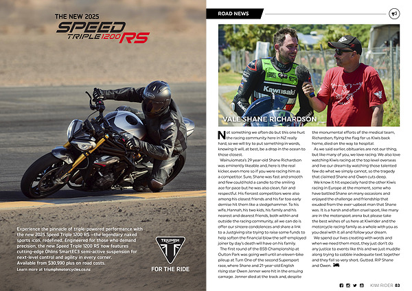 the monumental efforts of the medical team, Richardson, flying the flag for us Kiwis back home, died on the way to hospital. As we said earlier, obituaries are not our thing, but like many of you, we love racing. We also love watching Kiwis racing at the top level overseas and live our dream by watching those talented few do what we simply cannot, so the tragedy that claimed Shane and Owen cuts deep. We know it hit especially hard the other Kiwis racing in Europe at the moment, some who have battled Shane on many occasions and enjoyed the challenge and friendship that exuded from the ever-upbeat man that Shane was. It is a harsh and often cruel sport, like many are in the motorsport arena but please take the best wishes of us here at Kiwirider and the motorcycle racing family as a whole with you as you deal with it all and follow your dream. We spend our lives creating with words and when we need them most, they just don’ t do any justice to events like this and we just muddle along trying to cobble inadequate text together and they fall so very short. Gutted. RIP Shane and Owen.