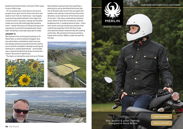 booked at Havelock North, still some 75km away. It was a 440km day. I’ m no camper, but Lance had us set up and we got all our gear into his three man tent and slept on one-inch air mattresses. I was happily surprised they didn’ t deflate in the night, but it took its toll on my back, anyway, the Nurofen intake was rising. We had huge days heading north- nearly nine hours of riding each day, and a good rest is essential to keeping alert levels high. Camping is a younger guys game, sadly.