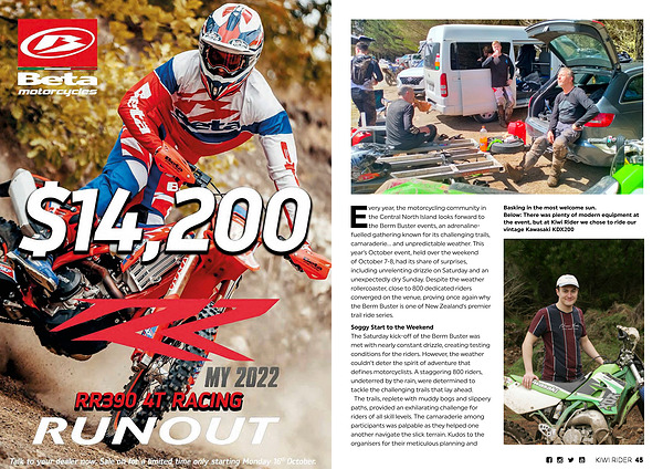 Every year , the motorcycling community in the Central North Island looks forward to the Berm Buster events , an adrenalinefuelled gathering known for its challenging trails , camaraderie ... and unpredictable weather . This year ’ s October event , held over the weekend of October 7-8 , had its share of surprises , including unrelenting drizzle on Saturday and an unexpectedly dry Sunday . Despite the weather rollercoaster , close to 800 dedicated riders converged on the venue , proving once again why the Berm Buster is one of New Zealand ’ s premier trail ride series .