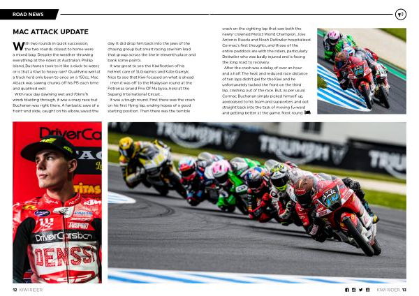 With two rounds in quick succession, the two rounds closest to home were a mixed bag. Despite the weather throwing everything at the riders at Australia’ s Phillip Island, Buchanan took to it like a duck to water, or is that a Kiwi to heavy rain? Qualifying well at a track he’ d only been to once on a 150cc, Mac Attack was sawing chunks off his PB each time and qualified well. With race day dawning wet and 70km / h winds blasting through, it was a crazy race but Buchanan was right there. A fantastic save of a front-end slide, caught on his elbow, saved the day. It did drop him back into the jaws of the chasing group but smart racing saw him lead that group across the line in eleventh place and bank some points. It was great to see the Kiwification of his helmet care of SLGraphics and Kate Garnyk. Nice to see that Kiwi focused on what is ahead. Then it was off to the Malaysian round at the Petronas Grand Prix Of Malaysia, held at the Sepang International Circuit … It was a tough round. First there was the crash on his first flying lap, ending hopes of a good starting position. Then there was the terrible