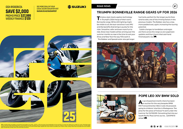 T & Cs: Suzukifest offers are available at participating Suzuki dealers from 1 / 11 / 25 – 31 / 1 / 26, or while stock lasts. All road registerable units are exclusive of on-road costs. Please ask your dealer for a quote. Advertised savings amount of $ 2,000 off RRP. $ 128.94 / week based on GSX-R1000R / ZA with RRP of $ 27,999, total amount payable $ 33,524.40, excluding on-road costs, nil deposit, 6.75 % p. a. fixed interest rate, 60-month loan term, total 260 weekly repayments, $ 10.35 PPSR fee, $ 0.50 weekly maintenance fee, $ 130 UDC loan fee and $ 200 dealer origination fee. Suzuki Finance is provided by UDC Finance Limited. Lending criteria, fees and standard terms and conditions apply. Excludes fleet purchases, demo units and all other promotions.