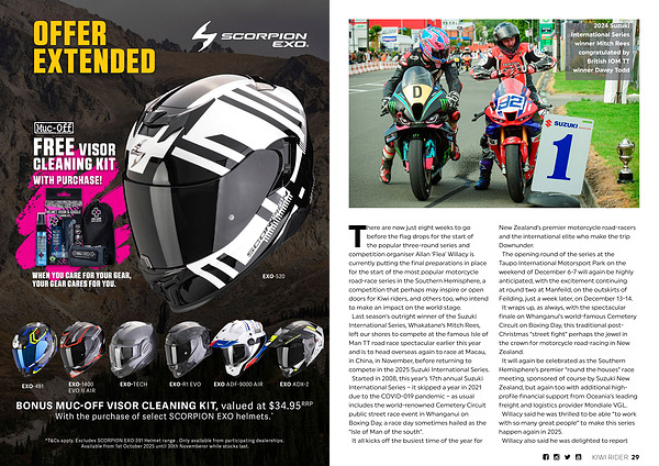 There are now just eight weeks to go before the flag drops for the start of the popular three-round series and competition organiser Allan‘ Flea’ Willacy is currently putting the final preparations in place for the start of the most popular motorcycle road-race series in the Southern Hemisphere, a competition that perhaps may inspire or open doors for Kiwi riders, and others too, who intend to make an impact on the world stage. Last season’ s outright winner of the Suzuki International Series, Whakatane’ s Mitch Rees, left our shores to compete at the famous Isle of Man TT road race spectacular earlier this year and is to head overseas again to race at Macau, in China, in November, before returning to compete in the 2025 Suzuki International Series. Started in 2008, this year’ s 17th annual Suzuki International Series – it skipped a year in 2021 due to the COVID-019 pandemic – as usual includes the world-renowned Cemetery Circuit public street race event in Whanganui on Boxing Day, a race day sometimes hailed as the“ Isle of Man of the south”. It all kicks off the busiest time of the year for