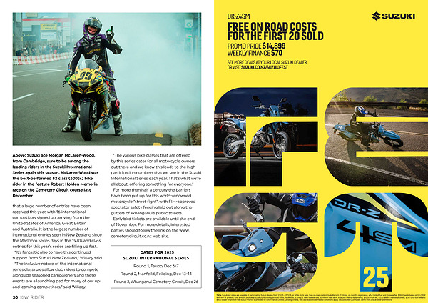 that a large number of entries have been received this year, with 16 international competitors signed up, arriving from the United States of America, Great Britain and Australia. It is the largest number of international entries seen in New Zealand since the Marlboro Series days in the 1970s and class entries for this year’ s series are filling up fast.“ It’ s fantastic also to have this continued support from Suzuki New Zealand,” Willacy said.“ The inclusive nature of the international series class rules allow club riders to compete alongside seasoned campaigners and these events are a launching pad for many of our upand-coming competitors,” said Willacy.