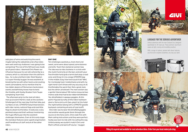 DAY ONE Ten challenges awaited us, most short and sweet, some were about speed, some balance and skills. Team Kiwi started at section two. The idea was to ride clockwise in a circle with the clutch hand only on the bars and with your free throttle hand grab a tennis ball atop a road cone and throw it in to a large CFMOTO bag in the middle. Easy, how hard could it be? Well, for me bloody hard. I stalled twice and with my right hand I can’ t throw with any accuracy at all. Comfortably the worst Kiwi. Not a great start, but the others all did well. The next section was a gentle S bend about 100 metres long and two metres wide that had to be ridden blindfolded. Yes, blindfolded, in opaque goggles. At this point I figured out why all the riders had been given a Sena coms unit( yes, given) at the hotel the night before( along with a CFMOTO goodie backpack containing all sorts of cool stuff). One rider was to wear the blindfold goggles and another would guide them through the course on the Sena coms. Chris rode first with Mark calling instructions and they were perfect. Scotty was keen to ride with me calling the way. Unfortunately, we couldn’ t match Chris and Mark’ s efforts and went off course – bugger.