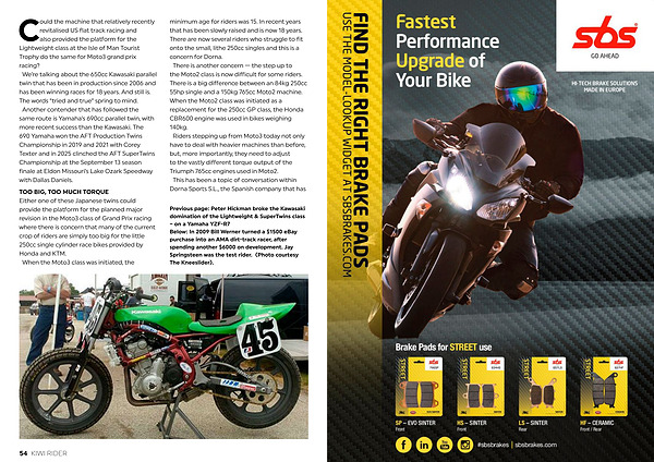 TOO BIG, TOO MUCH TORQUE Either one of these Japanese twins could provide the platform for the planned major revision in the Moto3 class of Grand Prix racing where there is concern that many of the current crop of riders are simply too big for the little 250cc single cylinder race bikes provided by Honda and KTM. When the Moto3 class was initiated, the