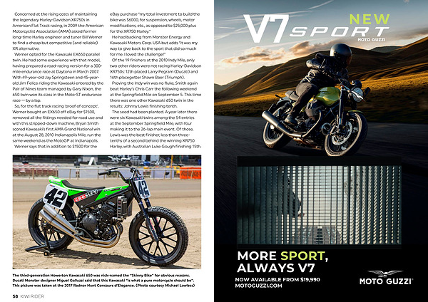 Concerned at the rising costs of maintaining the legendary Harley-Davidson XR750s in American Flat Track racing, in 2009 the American Motorcyclist Association( AMA) asked former long-time Harley engineer and tuner Bill Werner to find a cheap but competitive( and reliable) XR alternative. Werner opted for the Kawasaki EX650 parallel twin. He had some experience with that model, having prepared a road-racing version for a 300- mile endurance race at Daytona in March 2007. With 49-year-old Jay Springsteen and 45-yearold Jim Felice riding the Kawasaki entered by the Pair of Nines team managed by Gary Nixon, the 650 twin won its class in the Moto-ST endurance race— by a lap. So, for the flat track racing‘ proof of concept’, Werner bought an EX650 off eBay for $ 1500, removed all the fittings needed for road use and with this stripped-down machine, Bryan Smith scored Kawasaki’ s first AMA Grand National win at the August 28, 2010 Indianapolis Mile, run the same weekend as the MotoGP at Indianapolis. Werner says that in addition to $ 1500 for the
