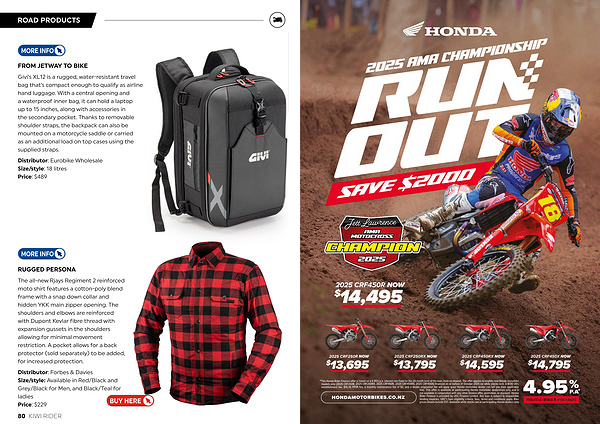 4.95 models only( 2025 CRF250R, 2025 CRF250RX, 2025 CRF450R, 2025 CRF450RX, 2025 CRF450X) financed on or before 31 October 2025( or while stocks last). A $ 130 UDC establishment fee, $ 10.35 PPSR fee, a monthly maintenance fee of $ 2, and a dealer origination fee will apply( your Honda motorbike dealer can tell you their applicable fee). This offer is available at participating Honda motorbike dealerships only and is not available in conjunction with any other finance offer, promotion, or discount. Honda Rider Finance is provided by UDC Finance Limited. Any loan is subject to responsible