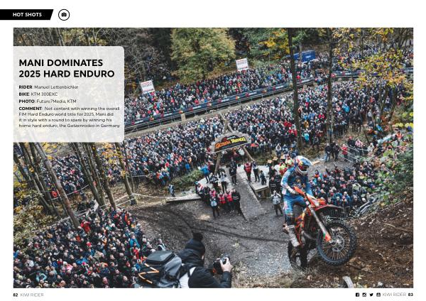 RIDER: Manuel Lettenbichler BIKE: KTM 300EXC PHOTO: Future7Media, KTM COMMENT: Not content with winning the overall FIM Hard Enduro world title for 2025, Mani did it in style with a round to spare by winning his home hard enduro, the Getzenrodeo in Germany.