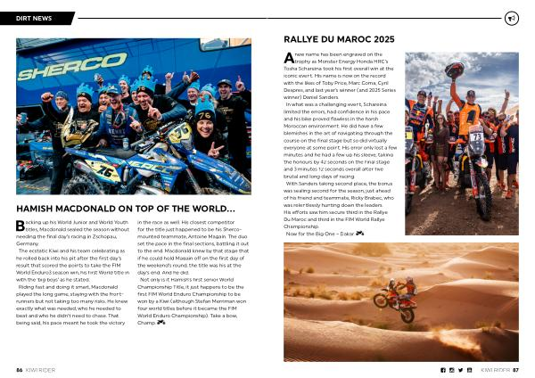 A trophy as Monster Energy Honda HRC’ s Tosha Schareina took his first overall win at the iconic event. His name is now on the record with the likes of Toby Price, Marc Coma, Cyril Despres, and last year’ s winner( and 2025 Series winner) Daniel Sanders. In what was a challenging event, Schareina limited the errors, had confidence in his pace and his bike proved flawless in the harsh Moroccan environment. He did have a few blemishes in the art of navigating through the course on the final stage but so did virtually everyone at some point. His error only lost a few minutes and he had a few up his sleeve, taking the honours by 42 seconds on the final stage and 3 minutes 12 seconds overall after five brutal and long days of racing. With Sanders taking second place, the bonus was sealing second for the season, just ahead of his friend and teammate, Ricky Brabec, who was relentlessly hunting down the leaders. His efforts saw him secure third in the Rallye Du Maroc and third in the FIM World Rallye Championship. Now for the Big One – Dakar.