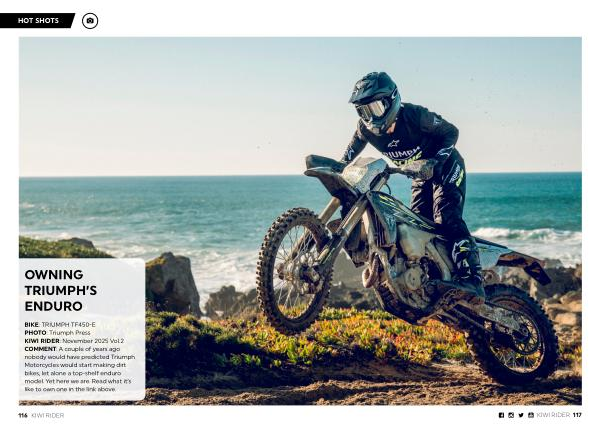 BIKE: TRIUMPH TF450-E PHOTO: Triumph Press KIWI RIDER: November 2025 Vol. 2 COMMENT: A couple of years ago nobody would have predicted Triumph Motorcycles would start making dirt bikes, let alone a top-shelf enduro model. Yet here we are. Read what it’ s like to own one in the link above.