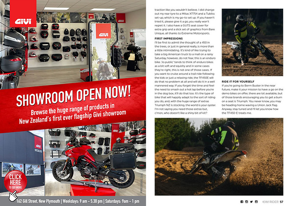 FIRST IMPRESSIONS I’ ll be first to admit the thought of a 450 in the trees, or just in general really, is more than a little intimidating. It’ s kind of like trying to take a big American truck to a mall on a rainy Saturday, however, do not fear, this is an enduro bike.‘ Jo public’ tends to think of enduro bikes as a bit soft and squishy and in some cases they’ re right, this is not one of those cases. If you want to cruise around a trail ride following the kids or just a relaxing ride, the TF450E will do that no problem at all and will do it in a well mannered way. If you forget the time and feel the need to smash out a hot lap before you’ re in the dog box, it’ ll do that too. It’ s the type of bike that will happily adapt to the sort of riding you do, and, with the huge range of extras Triumph NZ is stocking, the world is your oyster. I’ m not saying you need those extras but, c’ mon, who doesn’ t like a shiny bit of kit?