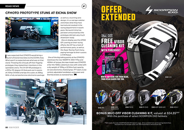 It was expected that CFMOTO would bring a bunch of brand new bikes to the EICMA show. What wasn’ t so expected was what was on that stand. Throwing the shrouds off their flagship prototype, they stated their intentions in the sportsbike arena. The V4 SR-RR prototype is a 997cc 90-degree V4 that puts out in excess of 210hp( 157kW) and tips the scales at 200kg. With a fully comprehensive electronics package as well as a stunning aero design, it is a real eye-catcher and shows what they have learned and created in the racing department in recent years. No launch time has yet been announced but the prototype did look very much showroom ready. Also on display was the 675NK GP. Leaning on their racing efforts, the GP has a host of performance parts, as well as the Aspar Racing Team livery, paying homage to their success in FIM Moto3. One of the big talking points at the CFMOTO stand was the new 1000MT-X. With 111hp and 405Nm of torque, the new model sees CFMOTO enter the 1000cc adventure class with a bike with a dry weight of 199kg, a 22.5litre fuel capacity, six-axis electronics, heated grips, TFT dash, cruise control, adjustable handlebars and screen and Brembo brakes as standard fare.