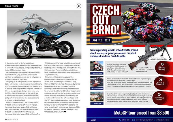 it shares the look of its famous bigger stablemates, right down to the X headlight and is a robust design, so yep, things just got serious in the 450 Adventure class. Factory options also include handlebar risers, spoked wheels( yep, tubeless cross-spoke version) as well as standard, low or rally seats so you can make your own bike. Weighing in at 178kg ready to ride, it promises to be a lively ride on tarmac, gravel or dirt in any configuration and naturally, being a BMW, there is already a catalogue of touring and adventure kit you can get to go straight onto your new F450GS. Even straight out of the box, it is a superbly well-equipped midsize adventurer, just perfect for exploring the backroads and shortcuts in New Zealand. The four model variants are F450GS Basic, F450GS Exclusive( incl. off-road footpegs, handguards, engine guard, Riding Modes Pro, Shift Assistant Pro and clear windshield), F450GS Sport( incl. off-road footpegs, handguards, engine guard, Riding Modes Pro,