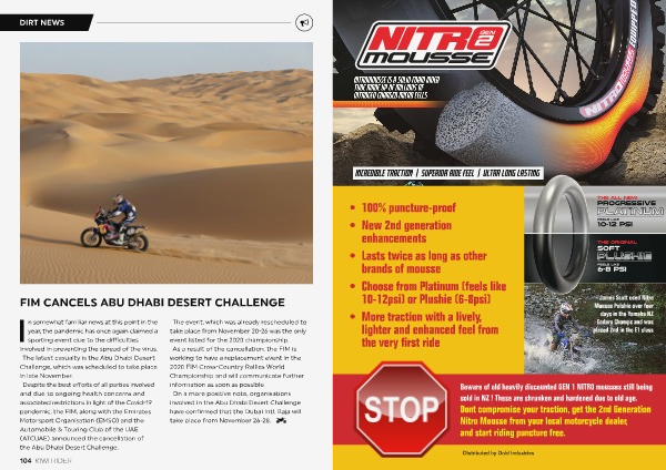 I n somewhat familiar news at this point in the The event , which was already rescheduled to year , the pandemic has once again claimed a take place from November 20-26 was the only sporting event due to the difficulties event listed for the 2020 championship . involved in preventing the spread of the virus . As a result of the cancellation , the FIM is The latest casualty is the Abu Dhabi Desert working to have a replacement event in the Challenge , which was scheduled to take place 2020 FIM Cross-Country Rallies World in late November .