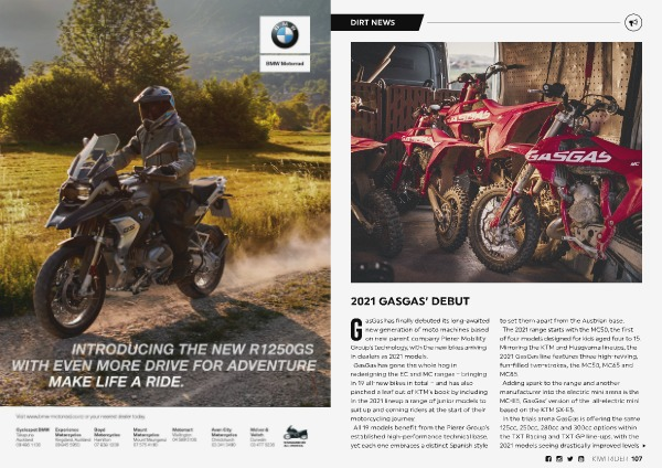 G asGas has finally debuted its long-awaited new generation of moto machines based on new parent company Pierer Mobility Group ’ s technology , with the new bikes arriving in dealers as 2021 models . GasGas has gone the whole hog in redesigning the EC and MC ranges – bringing in 19 all-new bikes in total – and has also pinched a leaf out of KTM ’ s book by including in the 2021 lineup a range of junior models to suit up and coming riders at the start of their motorcycling journey . All 19 models benefit from the Pierer Group ’ s established high-performance technical base , yet each one embraces a distinct Spanish style to set them apart from the Austrian base . The 2021 range starts with the MC50 , the first of four models designed for kids aged four to 15 . Mirroring the KTM and Husqvarna lineups , the 2021 GasGas line features three high-revving , fun-filled two-strokes , the MC50 , MC65 and MC85 . Adding spark to the range and another manufacturer into the electric mini arena is the MC-E5 , GasGas ’ version of the all-electric mini based on the KTM SX-E5 . In the trials arena GasGas is offering the same 125cc , 250cc , 280cc and 300cc options within the TXT Racing and TXT GP line-ups , with the 2021 models seeing drastically improved levels