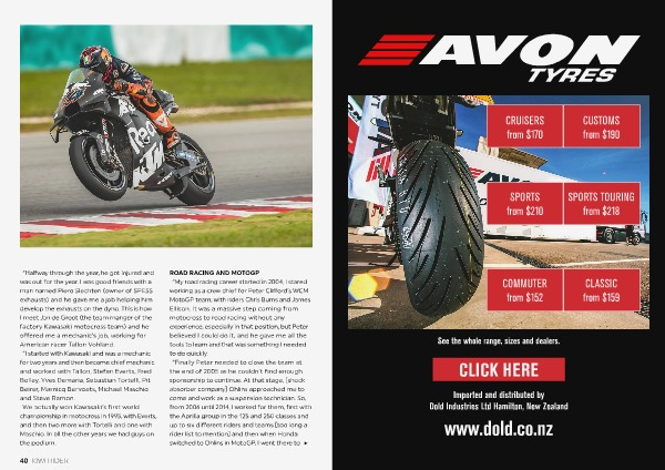 ROAD RACING AND MOTOGP “ My road racing career started in 2004 , I stared working as a crew chief for Peter Clifford ’ s WCM MotoGP team , with riders Chris Burns and James Ellison . It was a massive step coming from motocross to road racing without any experience , especially in that position , but Peter believed I could do it , and he gave me all the tools to learn and that was something I needed to do quickly . “ Finally Peter needed to close the team at the end of 2005 as he couldn ’ t find enough sponsorship to continue . At that stage , [ shock absorber company ] Ohlins approached me to come and work as a suspension technician . So , from 2006 until 2014 , I worked for them , first with the Aprilia group in the 125 and 250 classes and up to six different riders and teams [ too long a rider list to mention ] and then when Honda switched to Ohlins in MotoGP , I went there to
