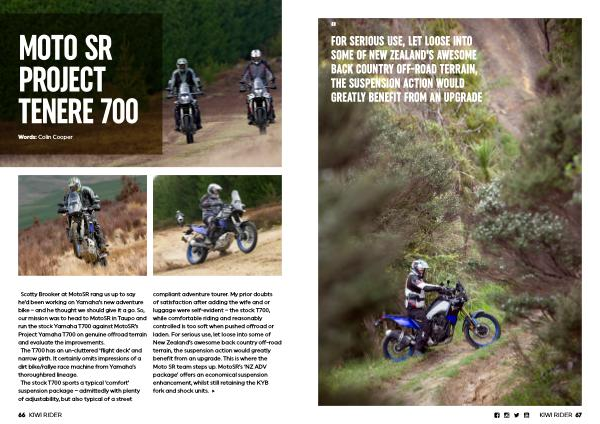 Scotty Brooker at MotoSR rang us up to say he ’ d been working on Yamaha ’ s new adventure bike – and he thought we should give it a go . So , our mission was to head to MotoSR in Taupo and run the stock Yamaha T700 against MotoSR ’ s Project Yamaha T700 on genuine offroad terrain and evaluate the improvements . The T700 has an un-cluttered ‘ flight deck ’ and narrow girth . It certainly omits impressions of a dirt bike / rallye race machine from Yamaha ’ s thoroughbred lineage . The stock T700 sports a typical ‘ comfort ’ suspension package – admittedly with plenty of adjustability , but also typical of a street compliant adventure tourer . My prior doubts of satisfaction after adding the wife and or luggage were self-evident – the stock T700 , while comfortable riding and reasonably controlled is too soft when pushed offroad or laden . For serious use , let loose into some of New Zealand ’ s awesome back country off-road terrain , the suspension action would greatly benefit from an upgrade . This is where the Moto SR team steps up . MotoSR ’ s ‘ NZ ADV package ’ offers an economical suspension enhancement , whilst still retaining the KYB fork and shock units .