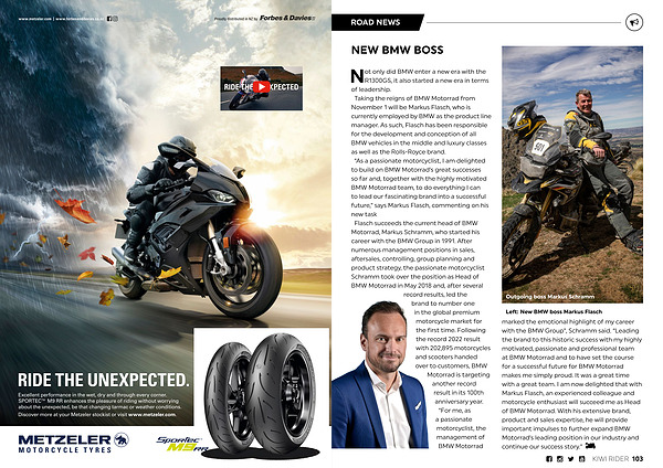 Left : New BMW boss Markus Flasch marked the emotional highlight of my career with the BMW Group ”, Schramm said . “ Leading the brand to this historic success with my highly motivated , passionate and professional team at BMW Motorrad and to have set the course for a successful future for BMW Motorrad makes me simply proud . It was a great time with a great team . I am now delighted that with Markus Flasch , an experienced colleague and motorcycle enthusiast will succeed me as Head of BMW Motorrad . With his extensive brand , product and sales expertise , he will provide important impulses to further expand BMW Motorrad ’ s leading position in our industry and continue our success story .”