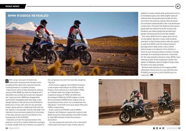 addition to being significantly optimised in terms of installation space also offers higher levels of stiffness than the predecessor model . For the rear frame , the previous tubular steel structure has now been replaced with a die-cast aluminium construction . The new EVO Telelever front wheel guide with flex element and the revised EVO Paralever rear wheel guide also provide even greater steering precision and ride stability . Tech-wise , BMW has once again gone all out on the big GS . Dynamic cruise control will be standard on New Zealand bikes with the option to add what BMW calls the Riding Assistant package which adds active cruise control ( which keeps a set distance from vehicles in front of you ), forward collision and lane change warnings . As is starting to become a necessity for the heavyweight adventure class , BMW is also offering as part of the suspension system the option of adaptive vehicle height to help make the bike more approachable . All these new updates to the flagship BMW adventurer have come at a cost , with the new R1300GS priced from a lofty $ 45,990 plus onroad costs .