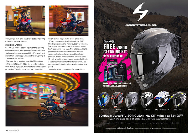 MINI BIKE WORLD CFMOTO’ s Papio Racer is a part of the growing mini bike market, but sporting full-on cafe racer styling and commuter capability. It’ s trendy and more than a little appealing to the eye, giving it a wide market appeal. The wee thing sports a very tidy 126cc single cylinder motor, paired to a six-speed gearbox. With its fuel injection, it makes for a fantastically nippy ride. The 12-inch wheels are class sizing,
