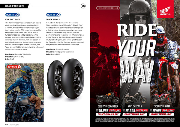 CMX500A2 $ 7.53 per day and 2023 CRF300LRA $ 7.18 per day) financed before 31 October 2025( or while stocks last) and is not available in conjunction with any other finance offer, promotion, or discount. Honda Rider Finance is provided by UDC Finance Limited. A $ 130 UDC establishment fee, $ 10.35 PPSR fee, a monthly maintenance fee of $ 2, and a dealer origination fee will apply( your Honda dealer can tell you their applicable fee). UDC’ s lending criteria, standard terms and conditions apply to any loan. Bike prices shown include GST. Available while stocks last at participating Honda dealers only. Onroad costs not included.