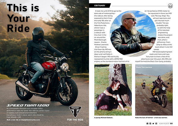 oil. Iā d wanted an R100 motor to be squeezed in there, but MD said,ā No way, Vege. You will just rape tyres and get into too much trouble.ā He was probably right, so with the help of his talented engineering mates the project was done, and, man, what a difference. From 22hp to 42hp at the back wheel in one fell swoop. MD loved exploring back roads and more and I was fortunate to share a few of his adventures over the years. Bill, MD and myself formed the Black Star Gang, probably