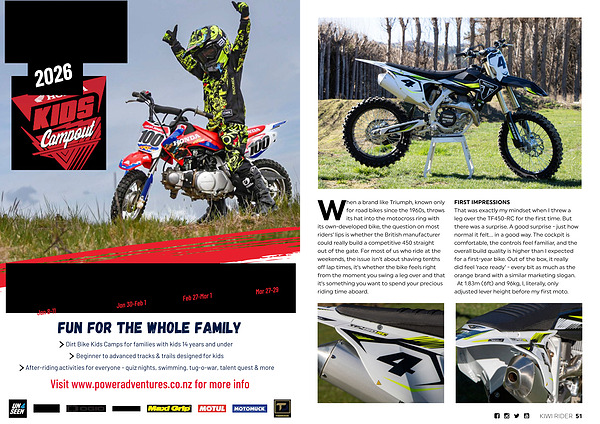 FIRST IMPRESSIONS That was exactly my mindset when I threw a leg over the TF450-RC for the first time. But there was a surprise. A good surprise- just how normal it felt … in a good way. The cockpit is comfortable, the controls feel familiar, and the overall build quality is higher than I expected for a first-year bike. Out of the box, it really did feel‘ race ready’- every bit as much as the orange brand with a similar marketing slogan. At 1.83m( 6ft) and 96kg, I, literally, only adjusted lever height before my first moto.