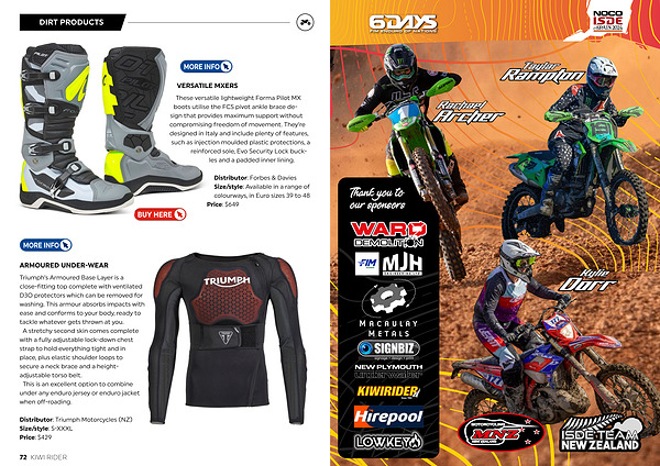 Triumph’ s Armoured Base Layer is a close-fitting top complete with ventilated D3O protectors which can be removed for washing. This armour absorbs impacts with ease and conforms to your body, ready to tackle whatever gets thrown at you. A stretchy second skin comes complete with a fully adjustable lock-down chest strap to hold everything tight and in place, plus elastic shoulder loops to secure a neck brace and a heightadjustable torso belt. This is an excellent option to combine under any enduro jersey or enduro jacket when off-roading.