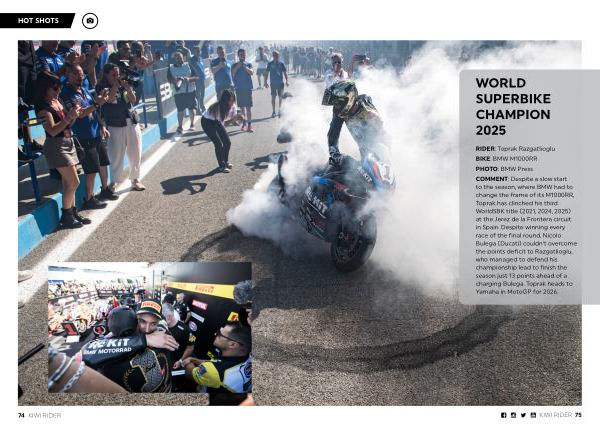 RIDER: Toprak Razgatlioglu BIKE: BMW M1000RR PHOTO: BMW Press COMMENT: Despite a slow start to the season, where BMW had to change the frame of its M1000RR, Toprak has clinched his third WorldSBK title( 2021, 2024, 2025) at the Jerez de la Frontera circuit in Spain. Despite winning every race of the final round, Nicolo Bulega( Ducati) couldn’ t overcome the points deficit to Razgatlioglu, who managed to defend his championship lead to finish the season just 13 points ahead of a charging Bulega. Toprak heads to Yamaha in MotoGP for 2026.