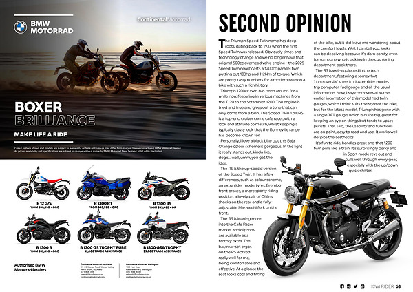 The Triumph Speed Twin name has deep roots, dating back to 1937 when the first Speed Twin was released. Obviously times and technology change and we no longer have that original 500cc overhead valve engine- the 2025 Speed Twin now boasts a 1200cc parallel twin putting out 103hp and 112Nm of torque. Which are pretty tasty numbers for a modern take on a bike with such a rich history. Triumph 1200cc twin has been around for a while now, featuring in various machines from the T120 to the Scrambler 1200. The engine is tried and true and gives out a tone that can only come from a twin. This Speed Twin 1200RS is a top-end cruiser come cafe racer, with a look and attitude to match, whilst keeping a typically classy look that the Bonneville range has become known for. Personally, I love a black bike but this Baja Orange colour scheme is gorgeous. In the light it really stands out, kinda like, dog’ s... well, umm, you get the idea. The RS is the up-spec’ d version of the Speed Twin. It has a few differences, such as colour scheme, an extra rider mode, tyres, Brembo front brakes, a more sporty riding position, a lovely pair of Ohlins shocks on the rear and a fullyadjustable Marzocchi fork on the front. The RS is leaning more into the Cafe Racer market and clip-ons are available as a factory extra. The bar / rear-set ergos on the RS worked really well for me, being comfortable and effective. At a glance the seat looks cool and fitting of the bike, but it did leave me wondering about the comfort levels. Well, I can tell you, looks can be deceiving because it’ s darn comfy, even for someone who is lacking in the cushioning department back there. The RS is well-equipped in the tech department, featuring a somewhat‘ controversial’ speedo cluster, rider modes, trip computer, fuel gauge and all the usual information. Now, I say controversial as the earlier incarnation of this model had twin gauges, which I think suits the style of the bike, but for the latest model, Triumph has gone with a single TFT gauge, which is quite big, great for keeping an eye on things but tends to upset purists. That said, the usability and functions are on point, easy to read and use. It works well despite the aesthetics. It’ s fun to ride, handles great and that 1200 twin pulls like a train. It’ s surprisingly perky and in Sport mode revs out and pulls well through every gear, especially with the up / down quick-shifter.