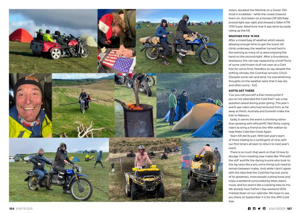 GOTTA GET THERE‘ Can you call yourself a Kiwi motorcyclist if you’ ve not attended the Cold Kiwi?’ was a key question raised during prize-giving. This year’ s event saw riders who had ventured from as far away as Perth, Australia and Dunedin make the trek to Waiouru. Sadly, it seems the event is shrinking rather than growing with official MC Neil Richy urging riders to bring a friend to the 49th edition to help Make Cold Kiwi Great Again. Team KR did its part. With last year’ s team of three tripling to a contingent of nine, with our first timers all keen to return to next year’ s event. There is so much that went on that I’ d love to divulge. From meeting new mates like“ Phil with the still” and Rik the daring truckie who took to the Ag races like a pro, some things just need to remain between mates. And, while I don’ t agree with the idea that the Cold Kiwi has lost some of its greatness, more people cutting loose and enjoy a weekend surrounded by bikes, beers, music and fun seems like a cracking idea to me. We already have Father’ s Day weekend 2026 marked down on our calendar. We hope to see you there on September 4-6 for the 49th Cold Kiwi.