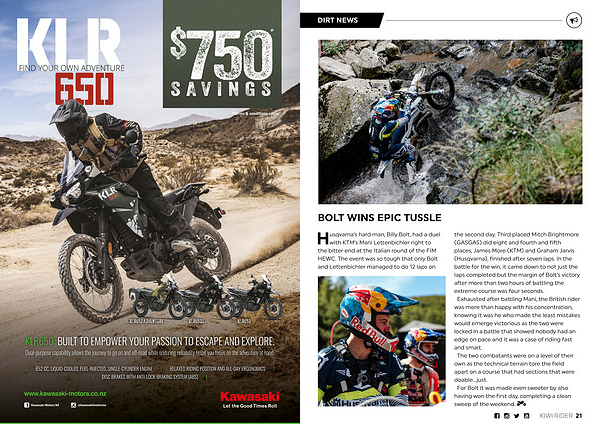 the second day. Third placed Mitch Brightmore( GASGAS) did eight and fourth and fifth places, James More( KTM) and Graham Jarvis( Husqvarna), finished after seven laps. In the battle for the win, it came down to not just the laps completed but the margin of Bolt’ s victory after more than two hours of battling the extreme course was four seconds. Exhausted after battling Mani, the British rider was more than happy with his concentration, knowing it was he who made the least mistakes would emerge victorious as the two were locked in a battle that showed nobody had an edge on pace and it was a case of riding fast and smart. The two combatants were on a level of their own as the technical terrain tore the field apart on a course that had sections that were doable … just. For Bolt it was made even sweeter by also having won the first day, completing a clean sweep of the weekend.
