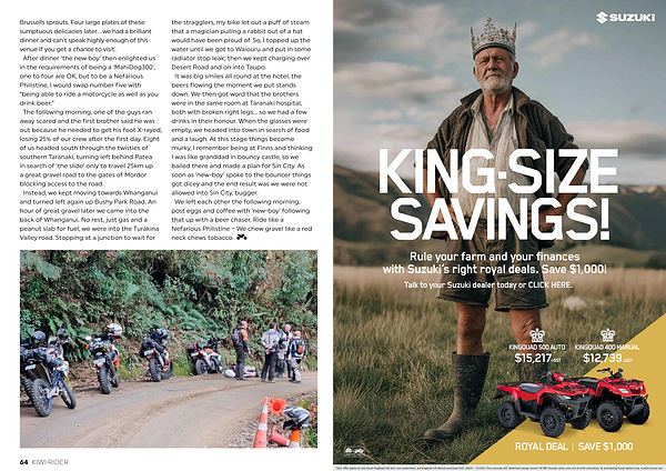 the stragglers, my bike let out a puff of steam that a magician pulling a rabbit out of a hat would have been proud of. So, I topped up the water until we got to Waiouru and put in some radiator stop leak; then we kept charging over Desert Road and on into Taupo. It was big smiles all round at the hotel, the beers flowing the moment we put stands down. We then got word that the brothers were in the same room at Taranaki hospital, both with broken right legs … so we had a few drinks in their honour. When the glasses were empty, we headed into town in search of food and a laugh. At this stage things become murky, I remember being at Finns and thinking I was like granddad in bouncy castle, so we bailed there and made a plan for Sin City. As soon as‘ new-boy’ spoke to the bouncer things got dicey and the end result was we were not allowed into Sin City, bugger. We left each other the following morning, post eggs and coffee with‘ new-boy’ following that up with a beer chaser. Ride like a Nefarious Philistine – We chew gravel like a red neck chews tobacco.