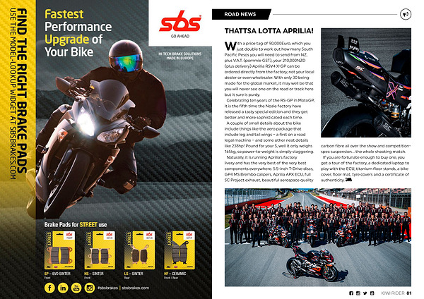 With a price tag of 90,000Euro, which you just double to work out how many South Pacific Pesos you will need to send from NZ, plus V. A. T.( pommie GST), your 210,000NZD( plus delivery) Aprilia RSV4 X-GP can be ordered directly from the factory, not your local dealer or even wholesaler. With only 30 being made for the global market, it may well be that you will never see one on the road or track here but it sure is purdy. Celebrating ten years of the RS-GP in MotoGP, it is the fifth time the Noale factory have released a tasty special edition and they get better and more sophisticated each time. A couple of small details about the bike include things like the aero package that include leg and tail wings – a first on a road legal machine – and some other neat details like 238hp! Pound for your $, well it only weighs 165kg, so power-to-weight is simply staggering. Naturally, it is running Aprilia’ s factory livery and has the very best of the very best components everywhere. 5.5-inch T-Drive discs, GP4 MS Brembo calipers, Aprilia APX ECU, full SC Project exhaust, beautiful aerospace quality