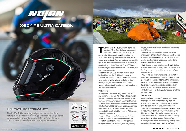 Truth be told, it actually wasn’ t Ben’ s, near constant,“ The Cold Kiwi was awesome, I can’ t wait for the next one” that got me on my bike riding south to Waiouru. Back in 2017, I went with my dad and, ever since, we’ ve sworn we’ d be back. But, as tends to happen, life got in the way. Between the birth of two kids, a pandemic and Dad’ s Triumph Tiger 1050 being written off just weeks before the 2024 event, the stars hadn’ t aligned. Fast forward to 2025 and now with us both having bikes for the first time in years- a Triumph America for Dad and a Moto Guzzi V7 for me, along with my brother, Callum, finally seeing the light and following us onto two wheels, it looked as if we’ d spend Father’ s Day in the best way possible.